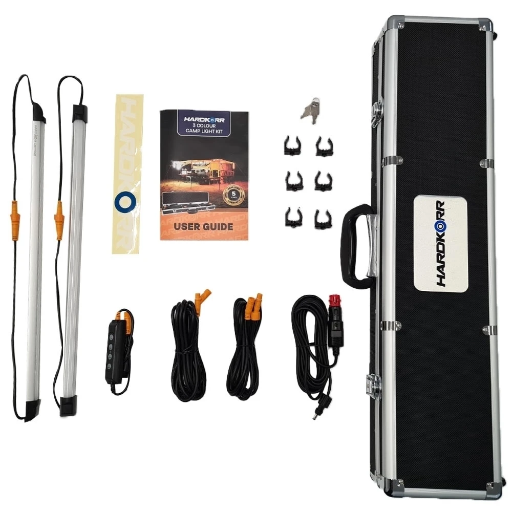 If you’re a beginner looking to illuminate your campsite, or you have a compact set up and don’t need to floodlight a footy stadium, then the 2 Bar LED 3 Colour Camp Light Kit from Hard Korr is perfect.