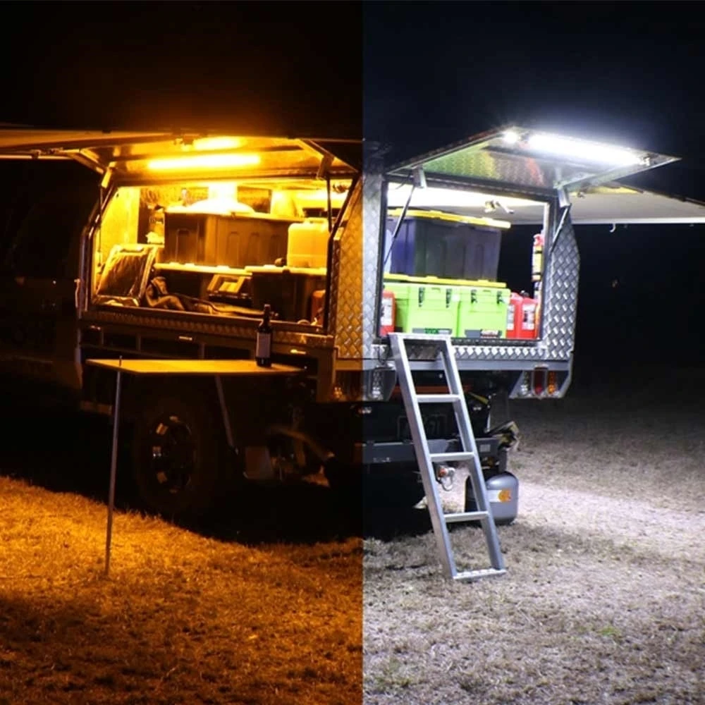 Setting these bars up is a breeze, as there are inbuilt magnets for attachment to metal surfaces, and removable pole clips for tent poles. The 2 Bar LED 3 Colour Camp Light Kit from Hard Korr is perfect for brightening up a canopy, toolbox, or smaller setup.