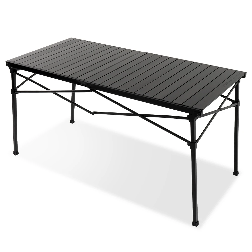 This 1400 x 700mm table can be set up or packed away in seconds and has a fixed height of 750mm. The tabletop consists of 24 x 55mm-wide heat-resistant anodised aluminium slats with a matte black finish. The 22mm powder-coated steel frame features a compact folding design, enabling the table to be easily packed away into its carry bag when not in use.