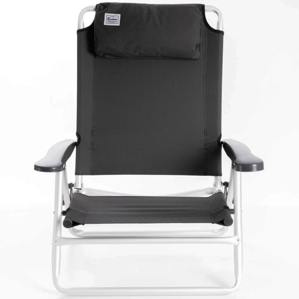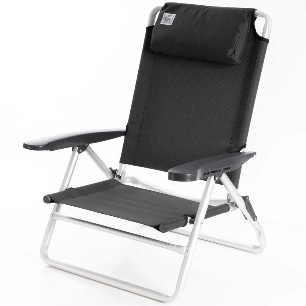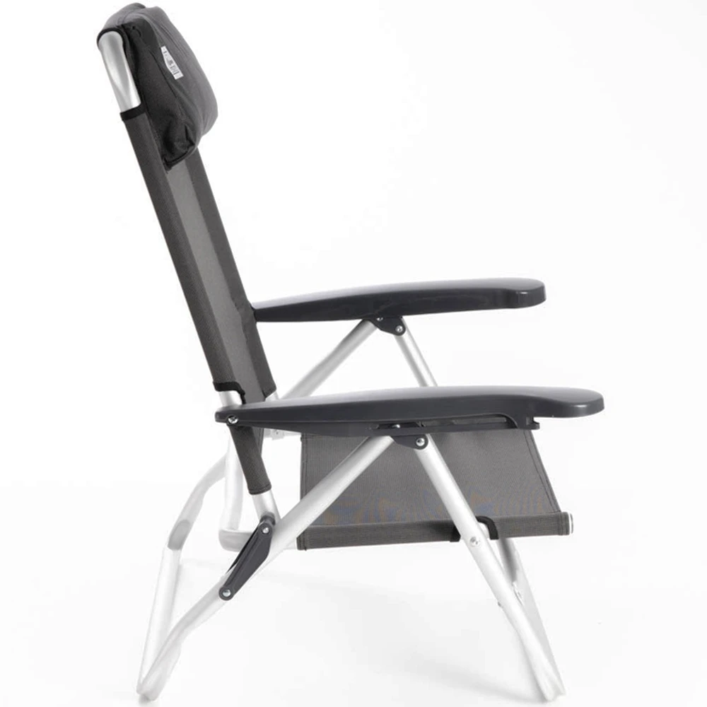 The aluminium frame is super lightweight but provides plenty of support with high impact ABS fittings for strength. The seat is made from two-tone dobby polyester with a non-sag surface, and you can kick back in one of the five reclining positions. You can also get up easily thanks to the solid and supportive arms, and lay back on the padded headrest if you feel like having a snooze.