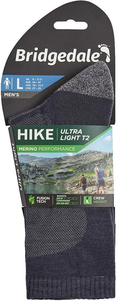 You can also rely on these socks to stay the same shape and size after washing. Keep dry, cool and comfy on the trail with the Hike Ultra Light T2 Crew Sock from Bridgedale.