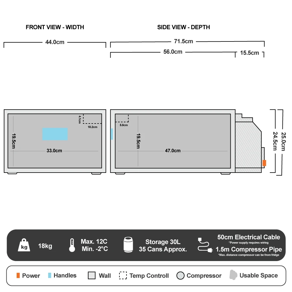 The cooling unit can be fitting on the left or right side of the cooler, and the 1.5m lead included provides a bit of flexibility. This low-profile compressor drawer fridge smoothly unlocks and opens in a single movement for easy access to your refreshments. If you like you can run this unit with solar panels, it also has low voltage protection, and you can regulate the temperature with the continuously variable thermostat.