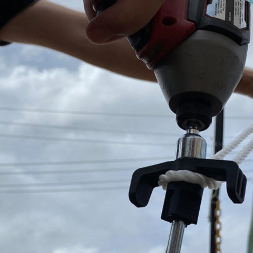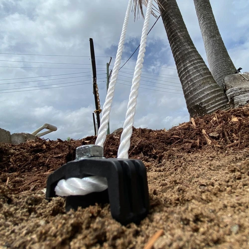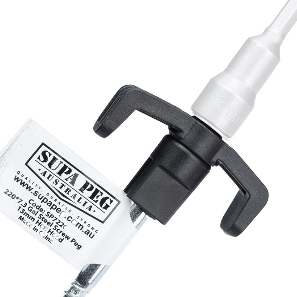 Measuring 220mm in length from the base of the hex head to the tip, the steel rod is 183mm long to give a secure hold. The heavy-duty spinning head has been redesigned to incorporate the spinning feature – meaning you can have your rope already attached when inserting the peg, and are less likely to get your fingers caught! The head has also been designed with a generous amount of room underneath the wings to cater for rope up to 12mm thick.