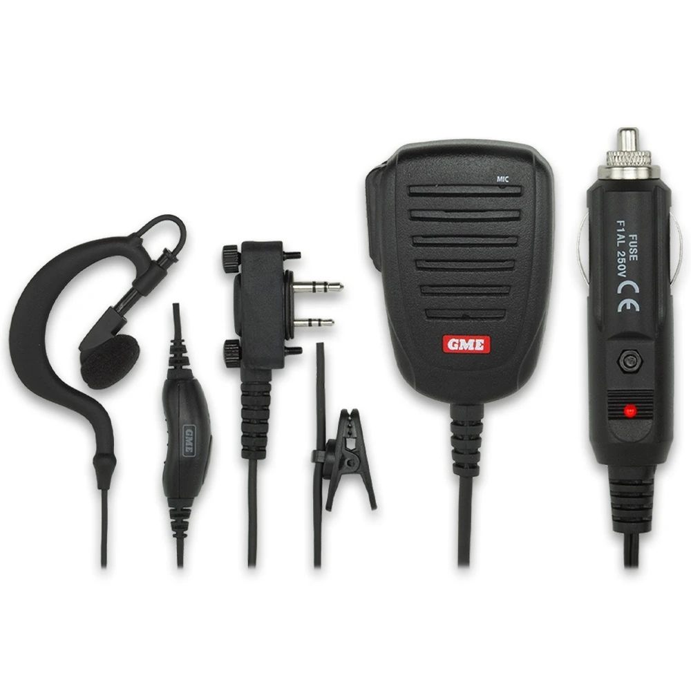 This kit is designed to be compatible with the range of TX6160X handheld radios from GME and comes with an IP67 speaker microphone, a 12V DC vehicle charger and an earpiece microphone.