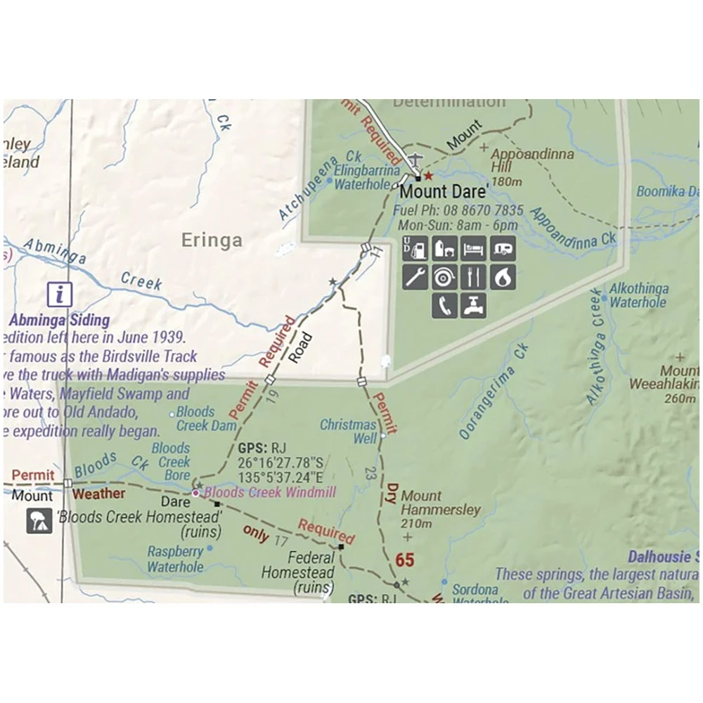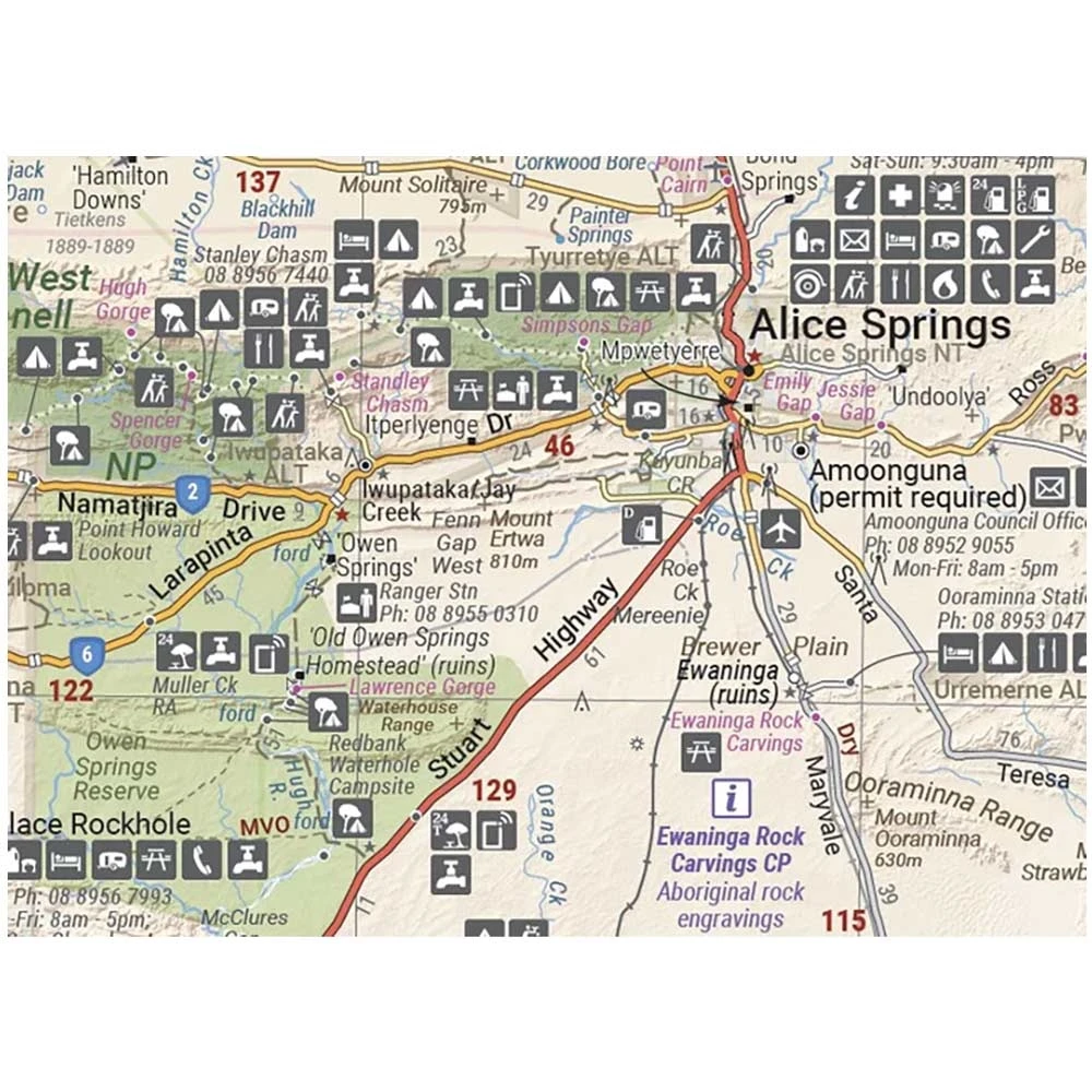 - Roads and 4WD tracks, distance markers, topographical relief and touring points of interest, 24-hour fuel, camping areas and caravan parks, facilities, services, and more