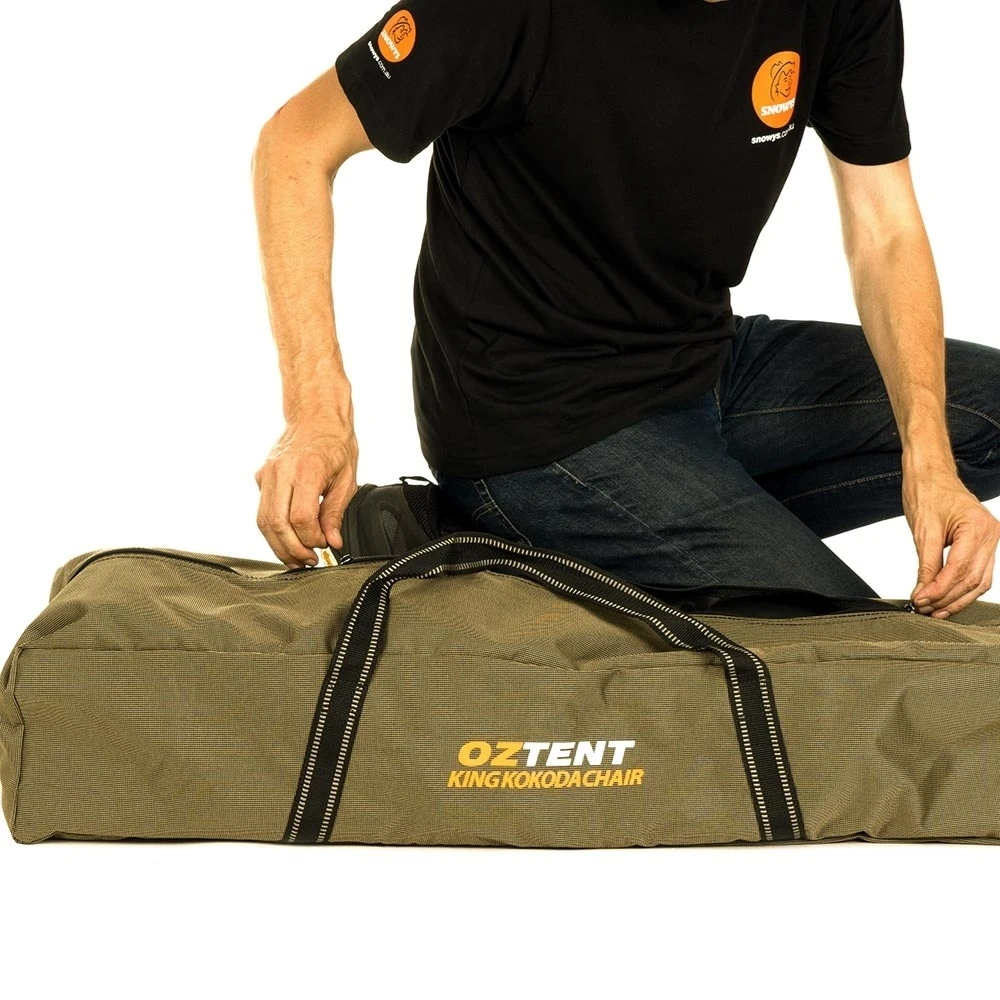 The carry bag creates extra padding when stored in the headrest while a heavy-duty steel frame combined with 600D fabric ensure your Oztent King Kokoda Chair provides years of reliable use.