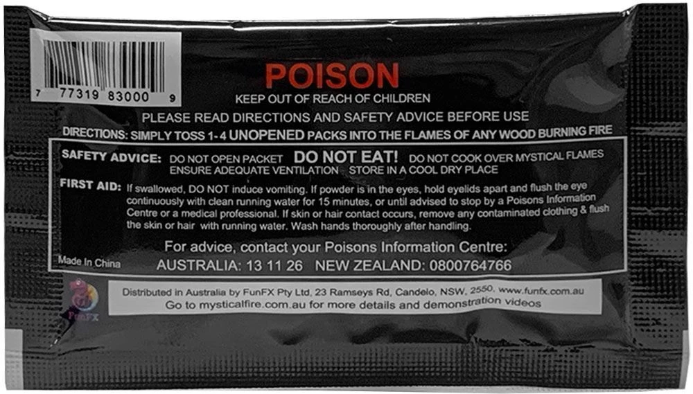 Mystical Fire is easy to use, just add 1-3 packets for best results into any wood burning fire and sit back and watch the flame turn blue, green and violet.