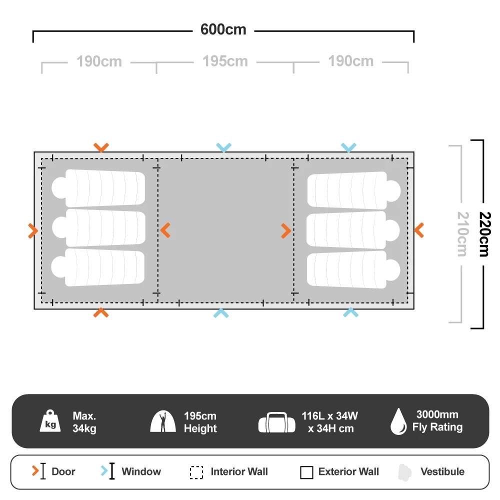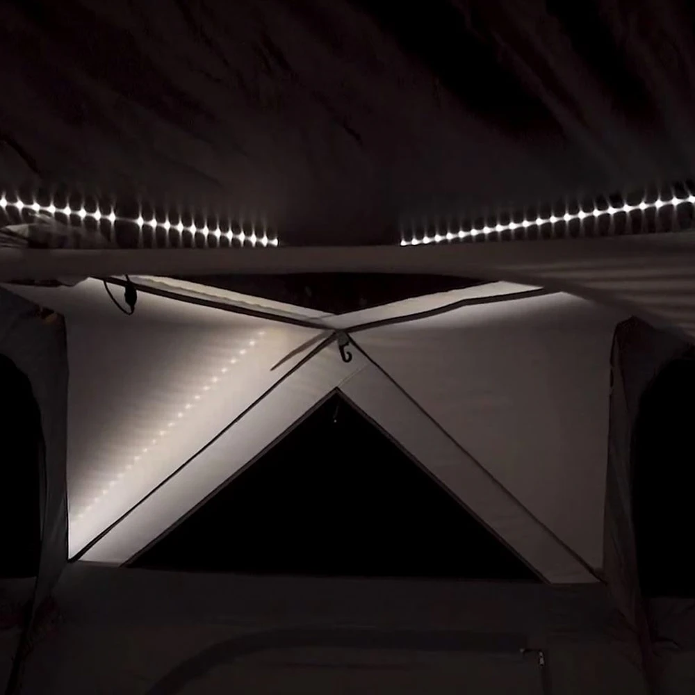 Open up the internal dividers inside this 6m long tent to create one large communal space or zip them up for 3 private bedrooms. There’s enough room for queen stretchers and airbeds, plus a swag of fancy features including the Lumos Integrated Lighting system. This LED strip lighting has been seamlessly integrated into the Fast Frame and provides up to 750 lumens when set to the highest of the 3 modes, but also allows for medium illumination and nightlight.