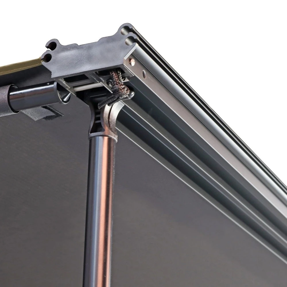 This 2.5 x 2.5m size awning is made from tough polycotton ripstop canvas, with an LST (Light Suppression Technology) coating which blocks out light and UV for protection and climate control. It also features an updated slimline design with box end construction which makes it a breeze to deploy as well as stowing away. This awning features twin channel alloy profiles which save space when you pack away the poles and has end caps to cover sharp edges. It also comes with 5 sail rope adaptable tracks to add extras such as extension walls, gear pockets or strip lighting plus a 600gsm laminated PVC cover with self-repairing zips for transit.