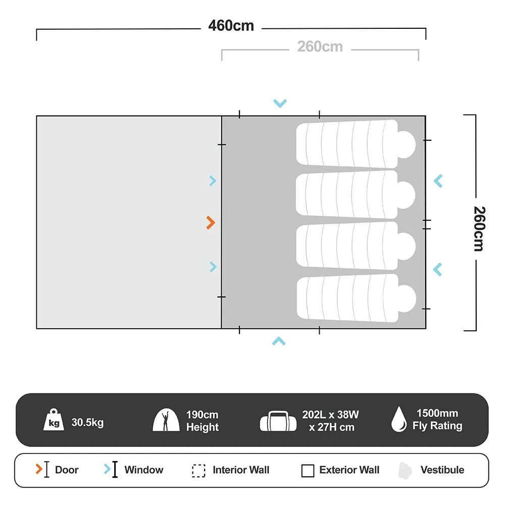- All poles, pegs and reflective guy ropes including awning peak poles and spreader bars