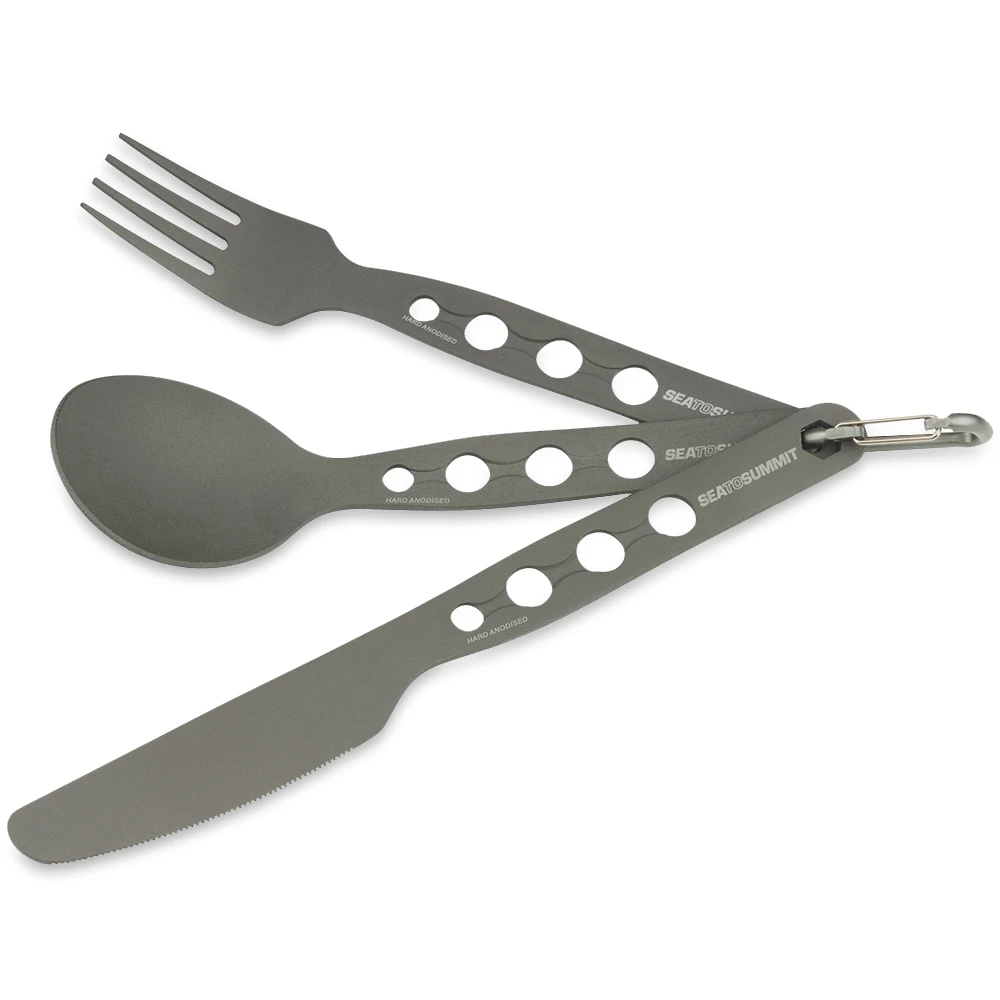 - 3-piece set including a knife, fork and spoon complete with mini carabiner for keeping them together and easy storage