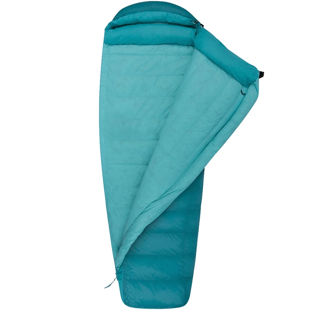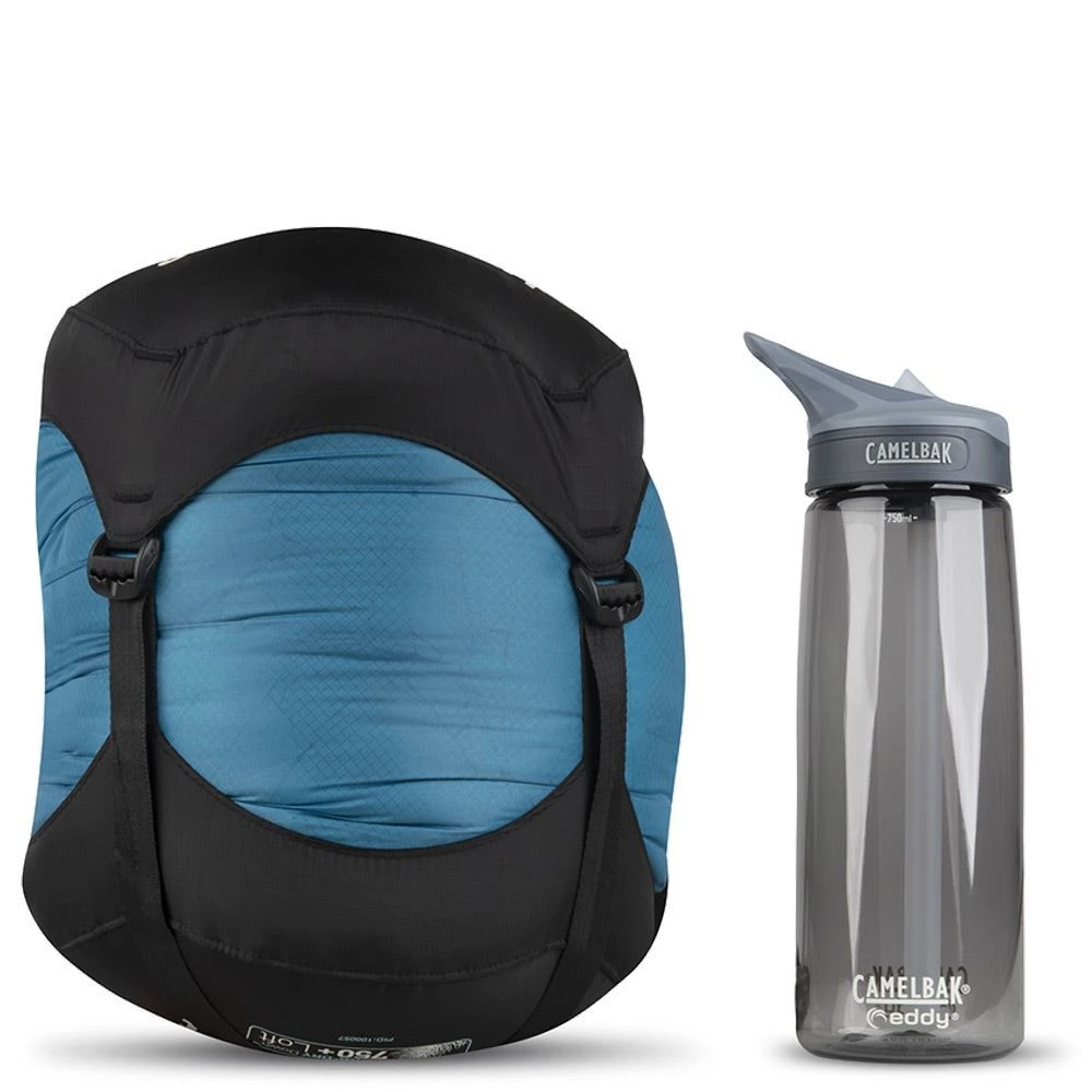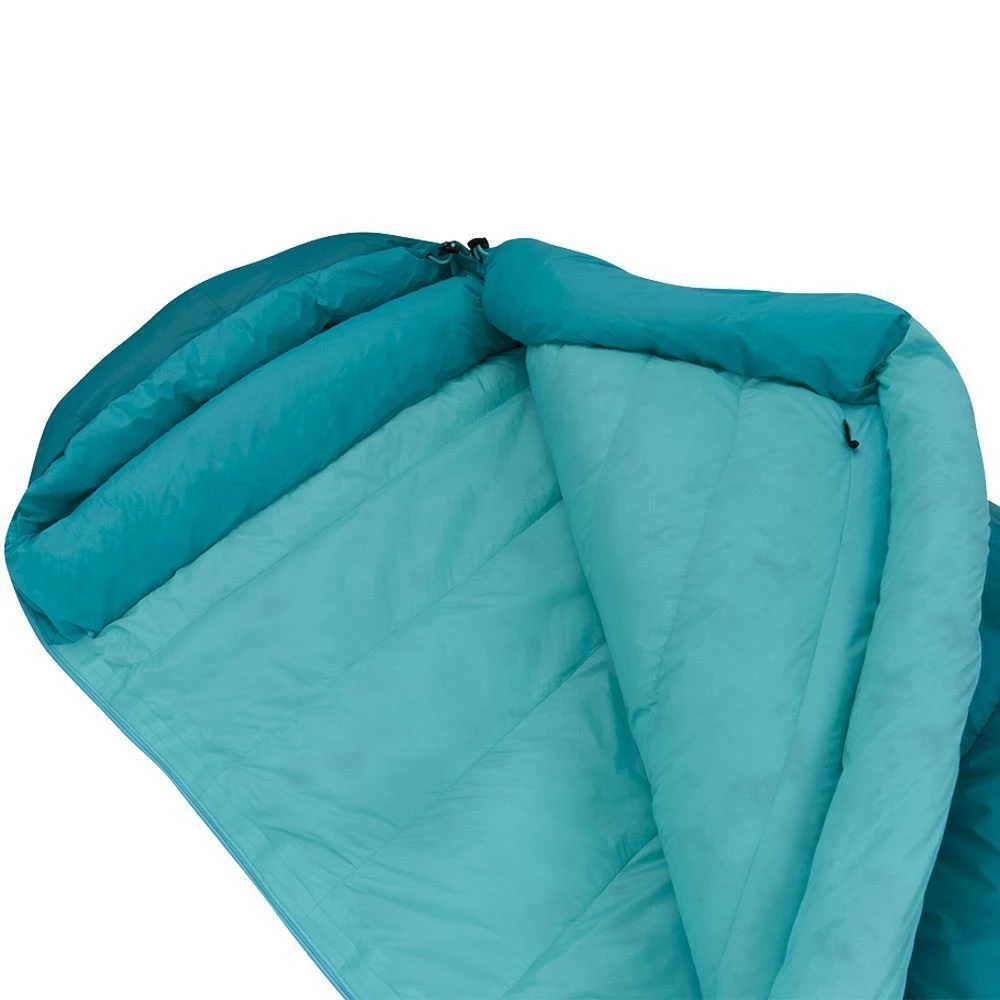 This sleeping bag is wider at the hips and narrower at the shoulders for a women’s specific fit and features a rectangular design which is roomier than a mummy shape. To keep the weight and packed size down, the shell and lining are made from light breathable while the vertical chest baffles help prevent cold spots and down migration. The fill is RDS certified 750+ ultra-dry down which provides superior insulation, and the foot area has THERMOLITE synthetic panels to prevent your ankles and feet getting cold.