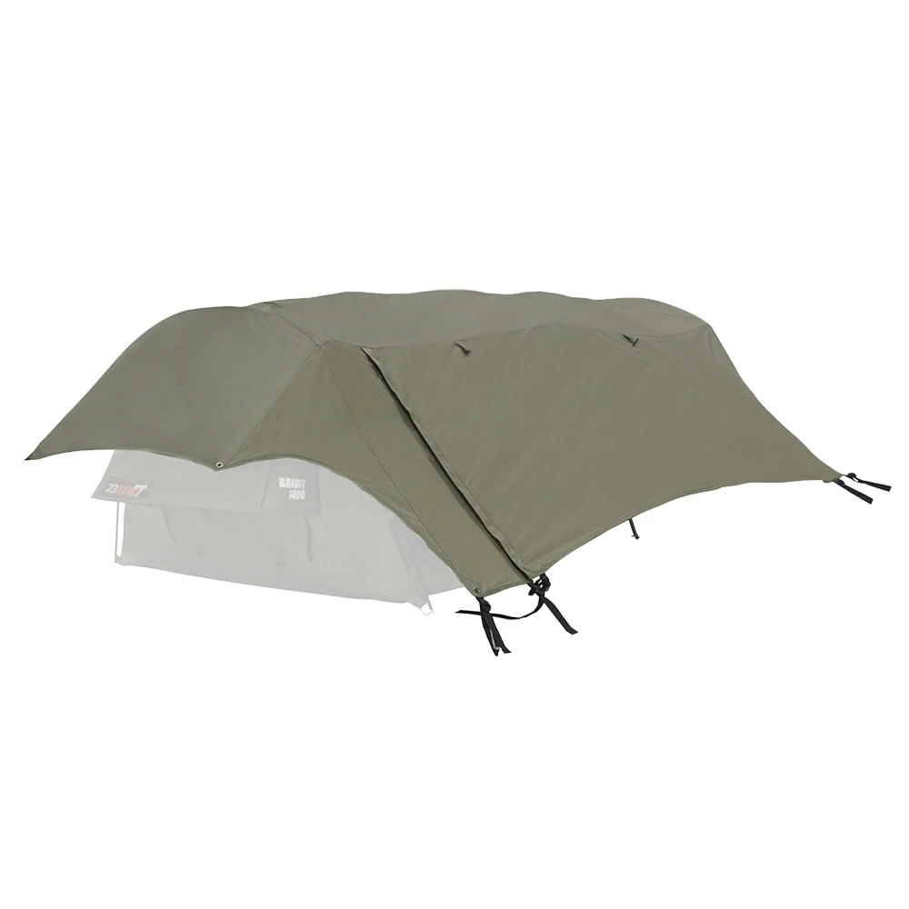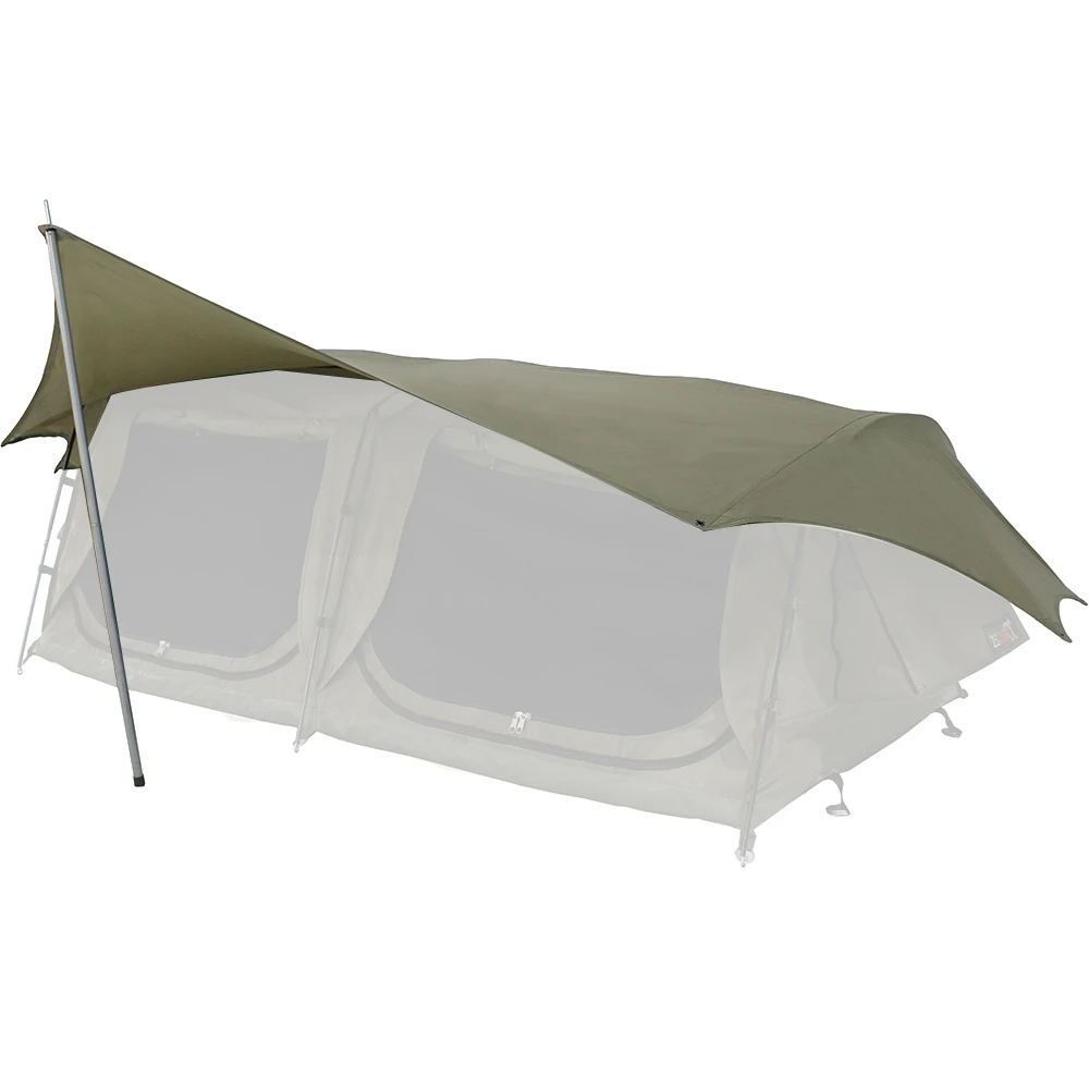 This swag fly is constructed from 210 denier polyester, with a 1500mm PU coating for protection. One end has a peaked awning which creates a sheltered doorway for more gear storage, and the other side has a zip down storm cover which gives you an alternative exit or entry. This fly attaches to the outer poles of any segmental pole swag and is suitable to use over your single, king single and double sized swags.