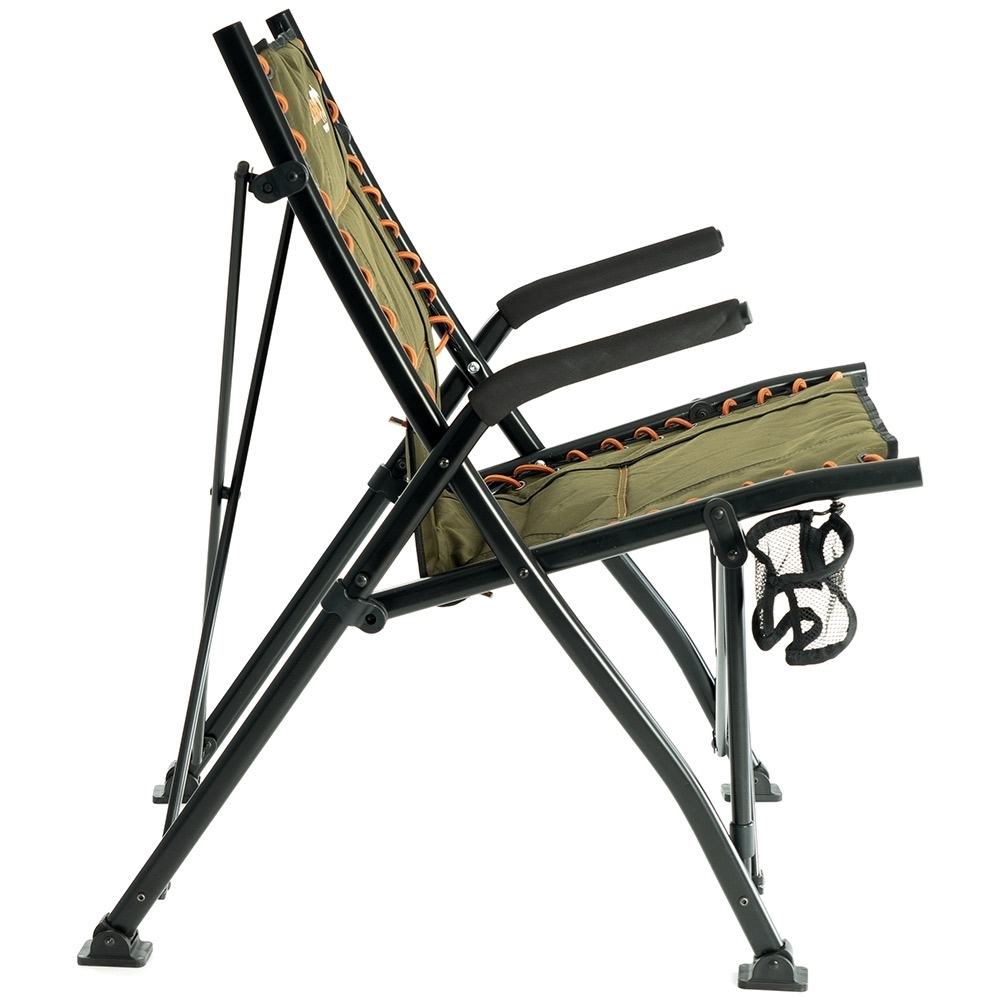 This chair has a clever contoured design that incorporates bands of shock cord that act as springs for more comfort as you sit. It’s got a double-layered and padded 600D back and seat for cushioning to relax in. The heavy-duty coated steel frame gives you a 150kg static weight rating while the large base swivel feet adds stability and prevents you sinking into soft ground. You can sip on any kind of bevvie and rest it in the drink holder as it accommodates a coffee mug with a handle as well as a wine glass for convenience. Packing it up so you’re ready to hit the road is hassle-free and the zippered carry bag makes transport a breeze.