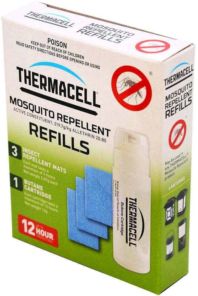 This pack contains one butane cartridge which will last up to 12 hours and can be used with all of the Thermacell lanterns and appliances except the Backpacker which uses a camping gas cartridge. The included repellent mats are compatible with all of the Thermacell appliances and lanterns, last for up to 4 hours of use per mat, and contains a repellant called allethrin which is a synthetic extract from the chrysanthemum flower.