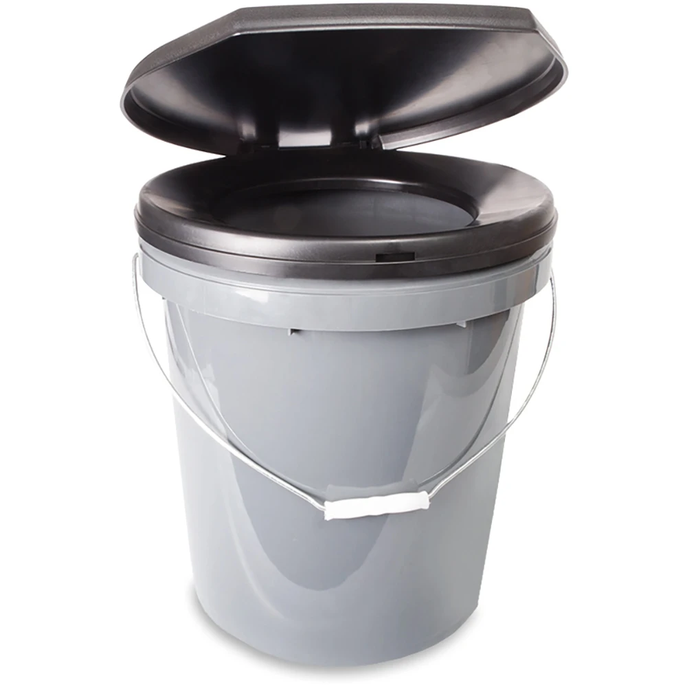 The simple yet sturdy bucket design has a traditional snap on hinged lid. It’s also lightweight and super easy to transport thanks to its convenient carry handle. All you have to do is line it with a separate plastic toilet bag and you’re good to go.